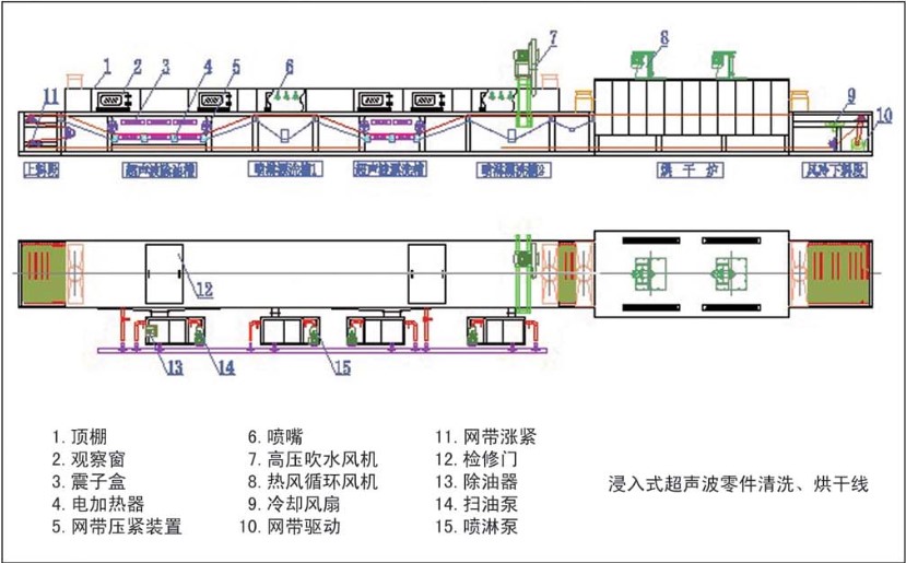 由機架、頂棚、超聲波除油槽、噴淋漂洗槽1、超聲波漂洗槽、噴淋漂洗槽2、循環(huán)副槽及過濾系統(tǒng)、油水分離系統(tǒng)、高壓風機吹水系統(tǒng)、烘干爐、風冷系統(tǒng)、傳動輸送系統(tǒng)、工件籃、電氣控制系統(tǒng)等組成。
